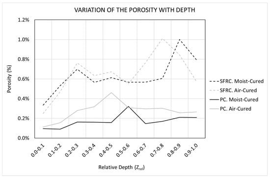 In the case of fiber-reinforced concrete, it is observed that porosity shows the minimum value in the exposed surface (depth range 0.0–0.1), and it tends to increase with the depth. In this region, smaller components show a higher percentage. In addition, the capacity to retain voids in fresh concrete is small, as fresh concrete is less viscous, as well as less stiff.