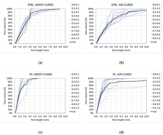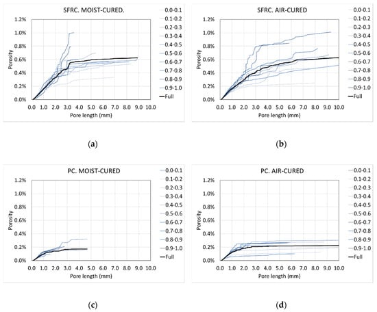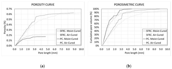 Figure 7a shows that the fiber-reinforced concrete specimens show a porosity greater than that of the plain concrete. Moreover, the curves belonging to fiber-reinforced concrete are over the ones belonging to plain concrete, which means that those ones show more voids in all the lengths.