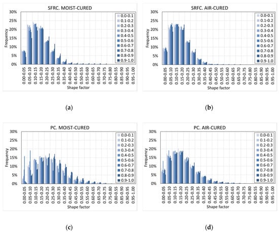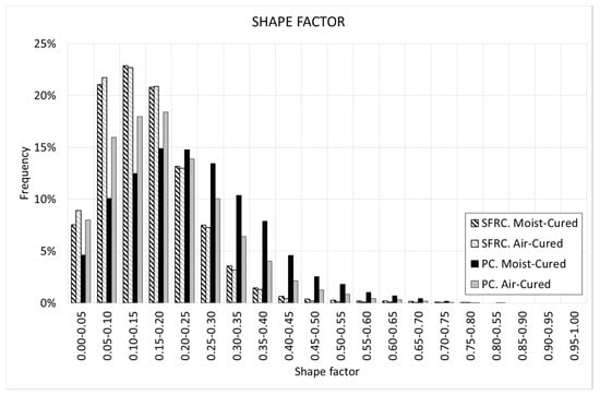 The study of the shape factor reveals that voids are far away from a sphere; in fact, they are very flaky or elongated. This phenomenon can be observed in both mixtures and in both curing conditions. However, voids belonging to the steel-fiber-reinforced concrete specimens show a smaller shape factor.