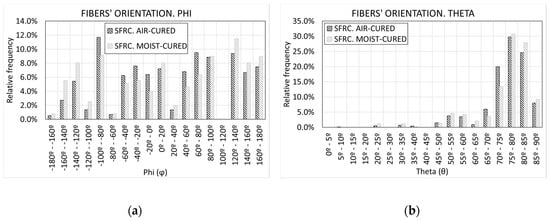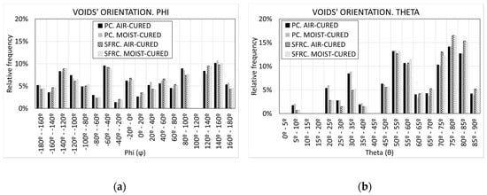These tendencies can be observed in both plain concrete and steel-fiber-reinforced concrete mixtures and also in both air-cured and moist-cured concretes. In the case of the phi angle, it can be highlighted that, in all cases, there is a uniform distribution of the voids inside the XY plane. No relevant differences can be observed between plain concrete and steel-fiber-reinforced concrete mixtures, and there are also no relevant differences between air-cured and moist-cured concretes. In the case of the theta angle, it can be highlighted that pores belonging to steel-fiber-reinforced concrete mixtures tend to be more horizontal, since they show higher relative frequency in the range of 70°–90° than plain concrete mixtures.