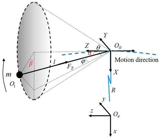 According to Equation (1), the in-plane swing angle θ and the out-of-plane swing angle φ are coupled with each other, and the motion of the space tethered combination in the maneuver process is a two-dimensional swing, generally. Furthermore, as shown in Figure 1, the target motion relative to O0 is distributed on the sphere, with O0 as the center and l as the radius, which is called ‘spherical swing’. This is the first swing form of the tethered combination, which is also the most common case. When , it can be obtained that , which means that the state can be kept infinitely. Therefore, it can be seen that the motion of the space tethered combination is in-plane swing if there is no out-of-plane swing disturbance at the initial time. This is the second swing form of the tethered combination. The target motion will evolve into a circular motion when the initial tangential velocity of the target satisfies certain conditions. This is the third swing form of the tethered combination, called conical swing, named according to the cone shape of the tether’s motion trajectory, which is another special case of spherical swing. In the conical swing form, the apex angle α is constant. The dynamic model of the space towing tethered combination is expressed in the spherical coordinate as follows: