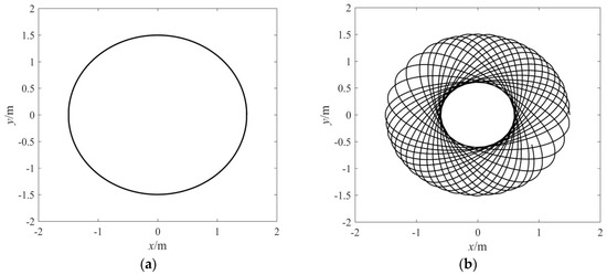 According to Equations (3) and (6), the swing of the space tethered combination was simulated. The system parameters were set up as follows: the initial tether length l0 = 3 m, the initial internal swing angle α0 = 30° = 0.52 rad, the acceleration az = −5 m/s2 and v0 = 2.08 m/s can be obtained by calculation from Equation (3). The simulation result of the target trajectory mapped to the XY-plane is shown in Figure 2a, which is a circle of 1.5 m radius. For comparison, the initial velocity of the target was set to v2 = 0.83 m/s; the simulation result of the target trajectory mapped to the XY-plane is shown in Figure 2b, which is composed of a series of precessional ellipses.