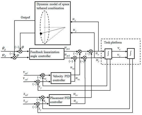 Due to the integral relationship between the acceleration, velocity and displacement, the acceleration and deceleration processes will mean that the velocity and displacement of the towing point are stable at a certain constant value over time. The PID controller was used to realize the velocity and displacement control of the towing point. Based on the feedback linearization control, a triple closed-loop anti-swing control strategy that includes angle closed-loop, velocity closed-loop and displacement closed-loop was designed, as shown in Figure 3.