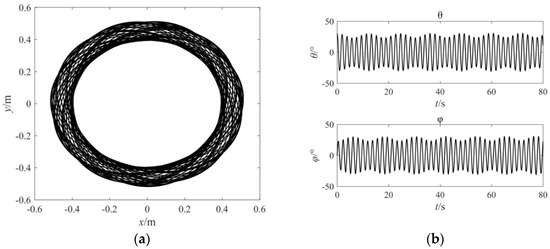 where ∆θ is the angle between the major axes of adjacent elliptical trajectories, and a and b are respectively the major axis length and minor axis length of the elliptical trajectory. The time history of the in-plane swing angle and out-of-plane swing angle are shown in Figure 4b. When the swing elimination control is not applied, the response of the in-plane and out-of-plane swing is varied amplitude periodical vibration, and there is a phase difference between them.