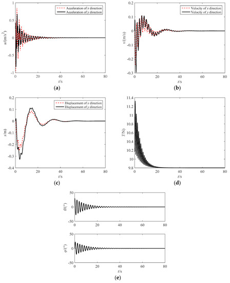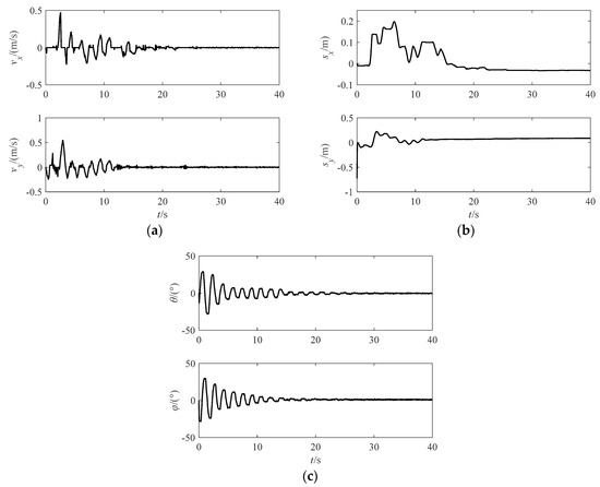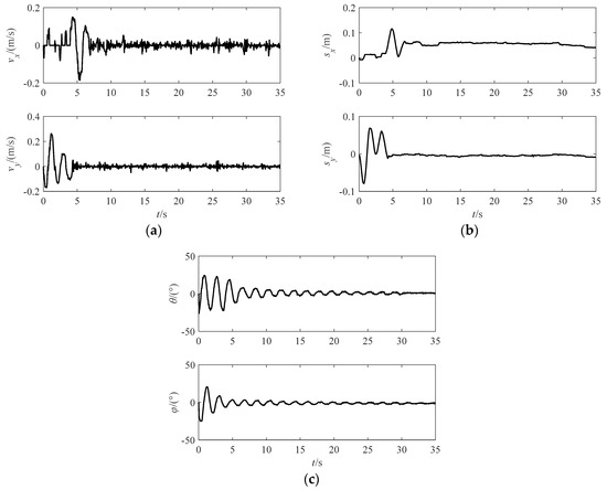 It can be seen that Equations (25) and (1) have the same form. Hence, according to the dynamic similarity, the effectiveness of the control strategy can be verified by this ground experiment system. The anti-swing experiment was conducted with the feedback linearization controller. The experiment results are shown in Figure 9. The effectiveness of the triple closed-loop control strategy based on the feedback linearization control was verified. Because the input of the feedback linearization controller was independent in the X and Y direction, it can be known that the control strategy is effective for the swing motion caused by any initial swing angles.