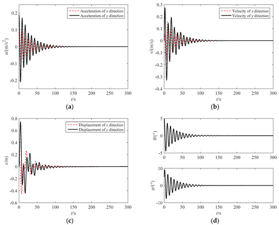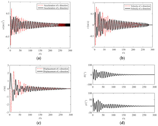 The complex control law (u’x, u’y) is obtained from the interaction of the angle closed-loop law (uαx, uαy), the velocity closed-loop law (uvx, uvy) and the displacement closed-loop law (usx, usy), which can control the swing angles of the target, and the velocity and displacement of the towing point. Assume that the initial state of the towing point is () = (x0, y0) = (0, 0), and the velocity is set at () = (xd, yd) = (0, 0). The control law (uvx, uvy) and the displacement control law (usx, usy) of the towing point are obtained by PID controller: