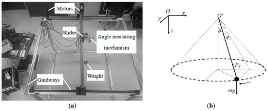 The ground experiment system included two orthogonal linear guideways, two servo motors, a two-dimensional angle measuring mechanism, a flexible tether, a movable slider simulating the towing point and a weight simulating the target, as shown in Figure 8a. The movable slider could move on the XY-plane, which was driven by the two servo motors, as shown in Figure 8b. The weight was connected to the movable slider by a thin tether. The two swing angles were measured by the two-dimensional angle measuring mechanism. In the experiment, the starting position of the slider was close to the positive center of the XY-plane, which ensured that the movable distance of the slider in the direction of the two axes was not less than 0.4 m.