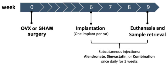 From the day following implantation, OVX and SHAM animals were subcutaneously administered alendronate (50 µg/kg of body weight) and simvastatin (5 mg/kg of bodyweight), alone or in combination, daily for 3 weeks, as previously [30] shown to promote bone formation in rats and near the human dose. The experimental groups and timetable are illustrated in Figure 1, and were: