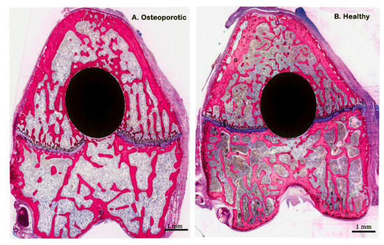 Representative histological images stained with methylene blue and basic fuchsin, showing non-decalcified (pMMA embedded) cross-sections in osteoporotic bone conditions.