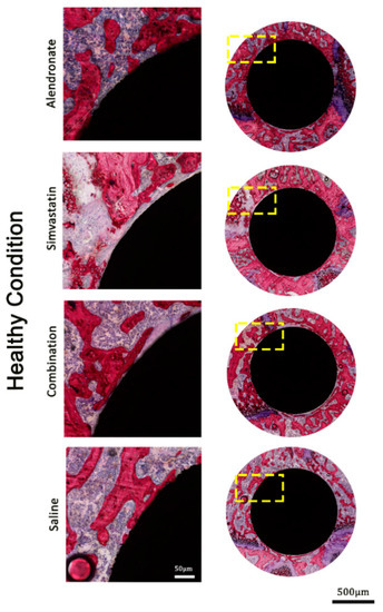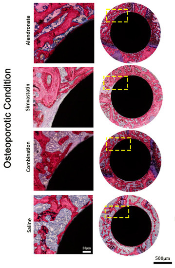 Assessment at higher magnification of the histological sections of the rats that received anti-osteoporotic drugs demonstrated that no gross differences in bone formation existed adjacent to the implants as treated with alendronate and simvastatin, alone or in combination, in both osteoporotic and healthy animals (Figure 3 and Figure 4). On the other hand, bone formation in these rats was considerably increased in the 1 mm peri-implant area compared with the osteoporotic and healthy rats that received saline treatment.