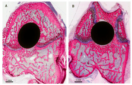 Representative histological images stained with methylene blue and basic fuchsin, showing non-decalcified (pMMA embedded) cross-sections displaying the varying amount of tight bone contact to implant in different treatment groups. (A) osteoporotic condition, alendronate group. (B) healthy condition, combination group.