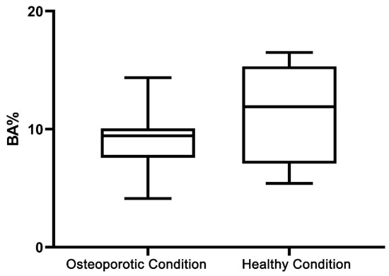 Box-and-whisker plot shows the histomorphometric bone area (BA%) in saline groups in both osteoporotic and healthy conditions.