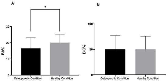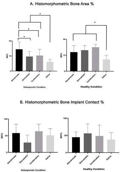 Bar-chart with mean and standard deviation, based on histomorphometric assessment, showing (A) bone area (BA%) and (B) bone-to-implant contact (BIC%) for the pooled data of the various drug treatment groups between osteoporotic and healthy conditions. (* indicates p < 0.01).