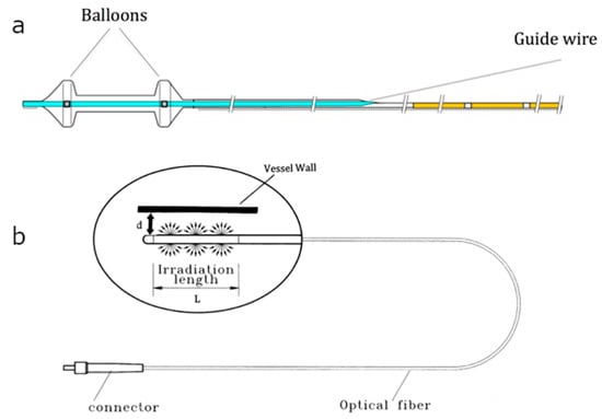 (a) Generic drawing of a stop-flow double balloon, multi-lumen nylon catheter (courtesy of Acrostak (Schweiz) AG); (b) generic drawing of a radial/cylindrical light diffuser for endovascular illumination (lower vessel wall omitted for clarity’s sake, courtesy of Medlight SA, Ecublens, Switzerland).