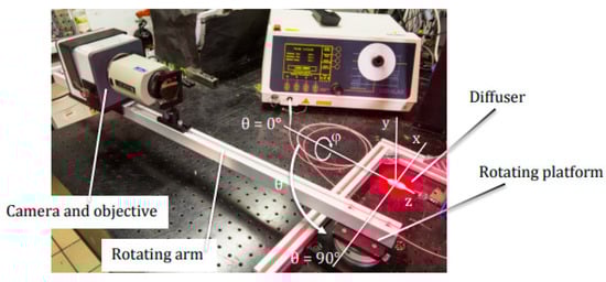 An imaging goniometer described in detail elsewhere [11] and presented in Figure 2 was used for the radiance measurements. In brief, this set-up uses a planar goniometer (arm length: 60 cm) to measure the angular and spatial values of the radiance at the surface of cylindrical light diffusers along two axes with a filtered scientific imaging camera (EM-CCD C9100-12, Hamamatsu, Hamamatsu City, Japan) fitted with a zoom lens (TV zoom lens H6 × 2.5R-MD3; 1:1.2, Fuji Photo Optical Co., LTD, Saitama City, Japan) and a neutral density filter of T = 0.1% to avoid saturation. The detector array has 512 × 512 pixels with pixel size of 16 × 16 µm2. Images of the radiance were treated by image processing software developed in house to determine, at each angle θ, the longitudinal values of the radiance at the surface of the light diffuser [11]. Interestingly, this software also determines the value of the radiance for different azimuthal angles φ at the surface of the cylindrical light diffuser. Basically, the idea is to exploit the cylindrical symmetry of the diffuser to derive the radiance for different values of φ.