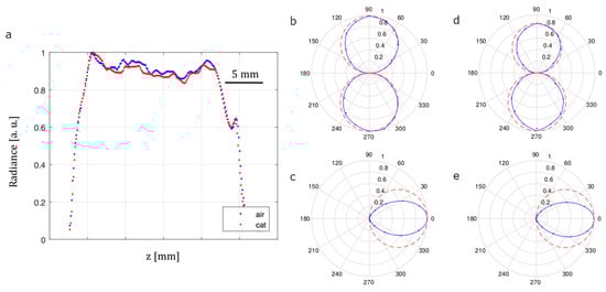 (a) Normalized longitudinal radiance profile of a radial/cylindrical light diffuser for endovascular illumination (at 652 nm in air (blue curve) or placed into a transparent vascular catheter sheathing (red curve, “cat”); = 0 deg.). The fiber distal end is located on the right. (b) Polar radiance profile of radial/cylindrical light diffuser for endovascular illumination (at 652 nm in air; φ = 0 deg.; arbitrary units). Red dotted line: Lambertian profile; blue line: measurements. Measurements and Lambertian profiles are superimposed at 90° and 270°. (c) Azimuthal radiance profile of radial/cylindrical light diffuser for endovascular illumination (at 652 nm in air; θ = 90 deg.; arbitrary units). Red dotted line: Lambertian profile; blue line: measurements. Measurements and Lambertian profiles are superimposed at φ = 0°. (d) Polar radiance profile of a radial/cylindrical light diffuser for endovascular illumination placed into a standard transparent vascular catheter (at 652 nm; φ = 0 deg.; arbitrary units) in air. Red dotted line: Lambertian profile; blue line: measurements. Measurements and Lambertian profiles are superimposed at 90° and 270°. (e) Azimuthal radiance profile of a radial/cylindrical light diffuser for endovascular illumination placed into a standard transparent vascular catheter (at 652 nm, θ = 90 deg.; arbitrary units) in air. Red dotted line: Lambertian profile; blue line: measurements. Measurements and Lambertian profiles are superimposed at φ = 0°.
