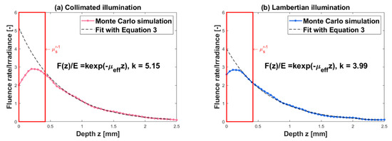 As illustrated in Figure 4, the shape of the fluence rate is significantly different, for an identical irradiance, at the tissue “surface” (where atherosclerotic plaques potentially sit) if the illumination is collimated or Lambertian. This difference is significant down to about 0.4 mm, i.e., µs’−1, as expected (see the red squares). Importantly, the pre-exponential factor “k”, used to fit the spatial evolution of the fluence rate with a solution of the diffusion approximation (Equation (3)), decreases from about 5.15 to 3.99 (more than 25% difference in our conditions) when a Lambertian illumination is considered instead of a collimated one. As a consequence, the nature of the tissue illumination (collimated or Lambertian) affects the fluence rate significantly, even in deep-seated tissues.
