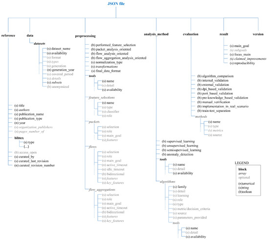 - The preprocessing block:This block summarizes all transformation and modification processes that datasets underwent previous to the main analysis (e.g., normalization, dimensionality reduction, feature extraction, filtering). The stored information is limited to the preprocessing specifically mentioned in the paper as a part of the presented methodology. This block also captures the set of network traffic features and/or flow keys that were used to represent traffic during subsequent analysis.Most fields in this block are binary and mandatory, allowing a fast curation of relevant preprocessing aspects. Subsequent blocks (e.g., feature_selections, packets, flows, and flow_aggregations) are optional, being suitable for cases where a more detailed, fine-grained definition is desired. Specifically, packets, flows, and flow_aggregations are blocks that indicate the type of traffic objects to analyze during experiments. The habitual trend is focusing on only one of these traffic objects.