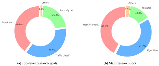 In the explored works, we found three main goals pursued by NTA research (Figure 4a):