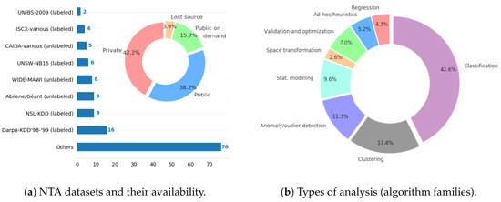 In this section, we use the NTARC tools and database (Section 4 and Section 6) to perform a critical exploration of the top NTA research conducted during the last two decades. The reviewed NTARC database release is [43]. We explored goals, foci, datasets, features, predominant algorithms, claimed contributions, and reproducibility aspects.