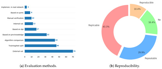 The last main top-level goal in NTA is traffic classification (about 40% of the studied papers). Whereas attack detection tends to use supervised machine learning and anomaly detection usually resorts to unsupervised algorithms, more varied options are developed for traffic classification. Here, the use of heuristics, schemes designed ad-hoc, and pre-knowledge not extracted by algorithms (i.e., known rules) are common. The frequent methodological weaknesses mentioned for the research oin the previous top-level goals also appear in traffic classification, yet this type of research is more heterogeneous, and therefore, finding common peculiarities is also more difficult.