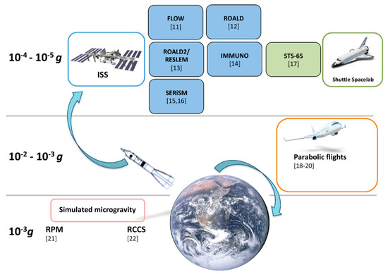 - Hauschild, S.; Tauber, S.; Lauber, B.; Thiel, C.S.; Layer, L.E.; Ullrich, O. T cell regulation in microgravity—The current knowledge from in vitro experiments conducted in space, parabolic flights and ground-based facilities. Acta Astronaut. 2014, 104, 365–377. [Google Scholar] [CrossRef]