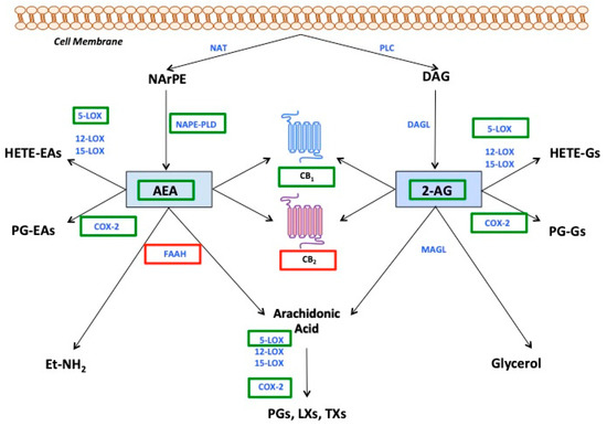 - Maccarrone, M. Metabolism of the Endocannabinoid Anandamide: Open Questions after 25 Years. Front. Mol. Neurosci. 2017, 10, 166. [Google Scholar] [CrossRef]