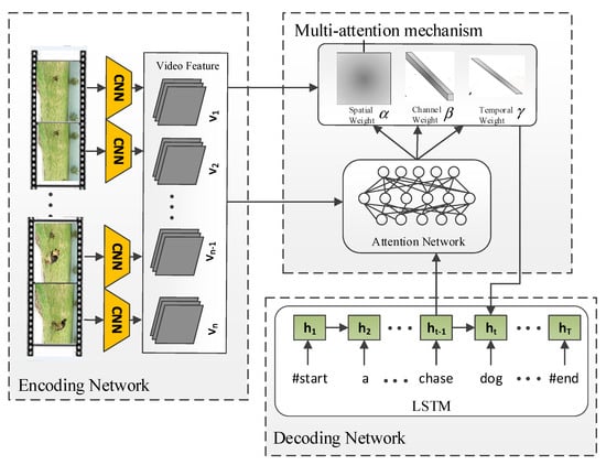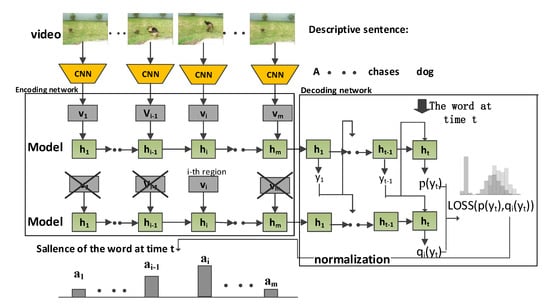 This paper attempts to adopt a top-down analysis on the model with the foundation of existing video description models and proposes significance analysis based on the visual video description. In detail, in an existing video description model, when we get a video and the corresponding description, we want to use the model directly to establish the correspondence between the input object and the words in the sentence, then output the saliency map of the video. The basic “encoding–decoding” model is used in this paper. As shown in Figure 3, the front to is the encoding network, which is the encoding network of the attention model proposed in the paper. Its main principle is to measure the significance level by figuring out the loss of information when using local visual inputs to approximate the entire input sequence.