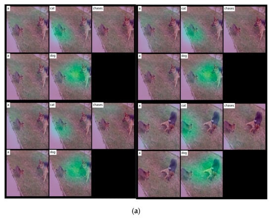 We selected a video in the MSVD and used the method introduced in the previous sections to obtain the salient region of each word in the sentence description model. In Figure 5, it was divided into three parts: the beginning of the video, the body of the video, and the end of the video. Additionally, each part displayed four images. The descriptive sentence was “a cat chases a dog.” Every picture had the same five video frames with a descriptive word representing the salience response of the descriptive word in the image over time in the top left corner. Furthermore, the luminosity of the salient region had a positive relationship with the intensity of salience response in that region.