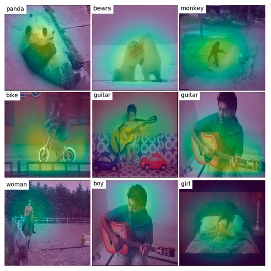 We selected representative images from the dataset. In Figure 6, the figure displays the salience response of the model to human, animal, and objects, respectively. In this picture, it can be seen that our model realized excellent salience responses to different categories and the model can distinguish between different categories. For example, when multiple categories appear in a figure, this model can generate the corresponding response properly.