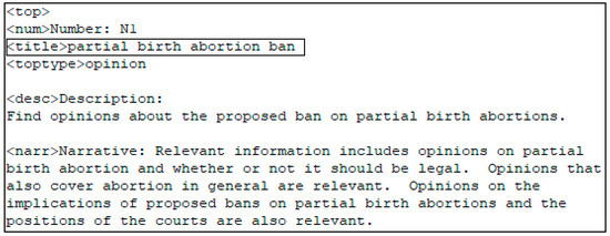 When it comes to TREC topics, it must be emphasized that each one has a title, a description, and narrative. These three parts represent three versions of the same query but with different lengths. The title is the shortest query and narrative the longest. In our tests, we used the shortest version called “title.” Figure 1 depicts the title of topic N1 from TREC 2003.