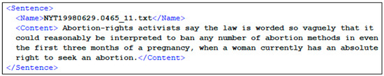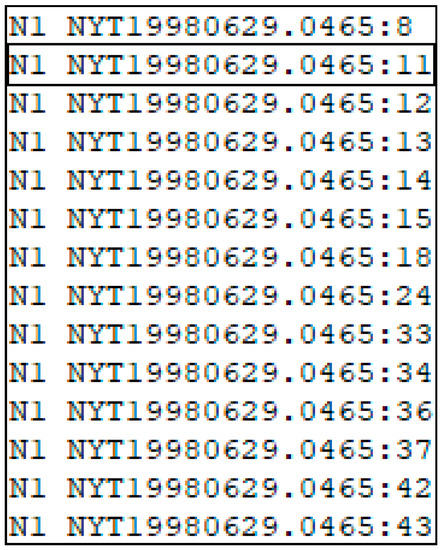 Every query was executed on 25 documents. Each of the documents consisted of multiple sentences as described in Table 2. Each sentence was marked with a beginning and ending tag. Each sentence had a number. Figure 2 shows an extract form document NYT19980629.0465 with sentence number 11.