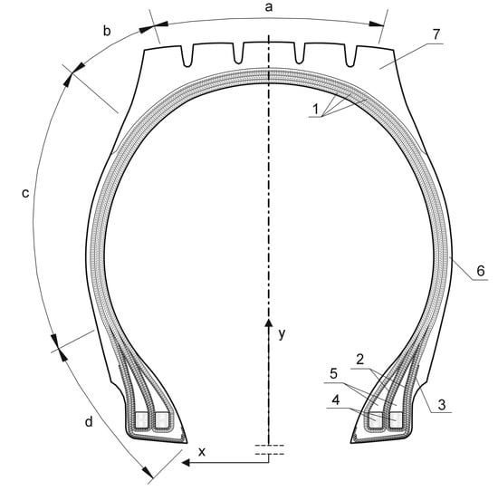 Meridional bias truck tire profile. a—crown, b—shoulder, c—sidewall, d—bead; 1—3 × ± θ doubled body plies, 2—flipper strips, 3—chafer, 4—bead wires, 5—bead fillers, 6—sidewall, 7—tread.