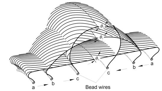 Figure 2. Changes in cords angle and density in a ply during tire forming stages: a—initial on the tire building drum, b—intermediate, c—final (θ2 < θ1 < θ0).