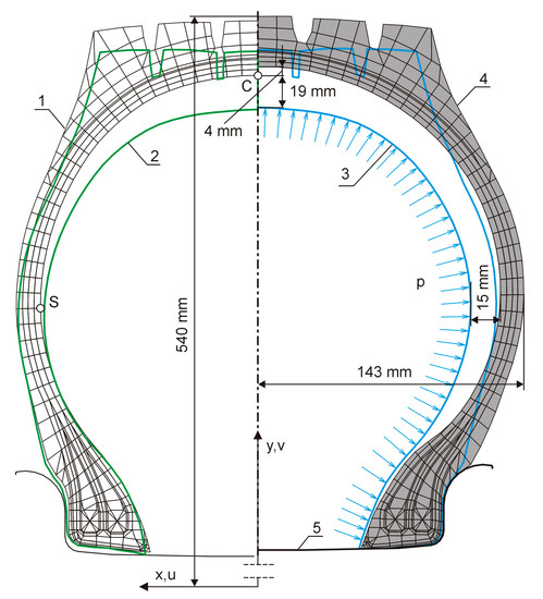 Displacements of the said C and S points but referenced to the tire profile in the mold amounted to 4 mm and 13 mm, respectively. The external diameter of the inflated tire and its width, as obtained from the model, amounted to 1080 mm and 286 mm, respectively. The diameter value was consistent with the catalog requirements for this tire, and the width difference was −1.7%. This shows that the tire profile in the mold was designed correctly, and the model correctly predicted the overall dimensions of the actual tire. It must be noted that this tire—once manufactured in a series—was correctly designed and fulfilled all requirements stipulated in the European Tyre and Rim Technical Organisation (ETRTO) documents.
