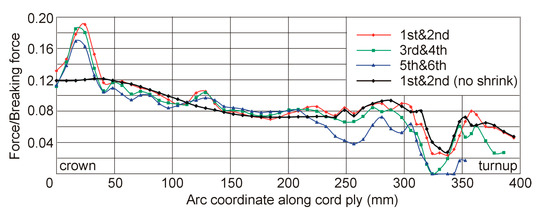 In the case of tire inflation analysis and neglecting cord shrinkage, quite a mild fluctuation in body ply cord forces from the tire crown to the bead wire area was observed, which was consistent with the results obtained on the tire netting model (cf. [27] (p. 84, Figure 71a)). When considering the stresses generated by cord shrinkage, considerable variations in cord forces were observed. In particular, in the tire crown, there was almost a 60% increase in force value in the first and the second ply cords. It should be assumed that a certain influence on this increase was contributed by the first groove in the tire tread. The highest values of forces were obtained for innermost plies (first and second) cords, as this was where the internal pressure was applied, and these values decreased for plies located more outwards in the tire, which was consistent with the principles of deformable body mechanics.