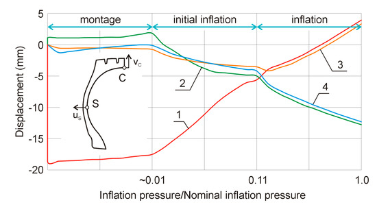 Displacement variation of C and S points located on inner profile of vulcanized tire in mold versus relative inflation pressure; 1—vC, 2—uS, and 3—vC, 4—uS for shrinkage neglected.