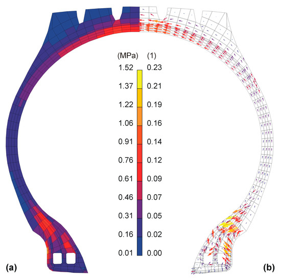 The stable finite element tire model makes it possible to obtain many usable results. Figure 8a presents a map of equivalent Cauchy stresses occurring only in purely rubber elements. The highest values of these stresses could be observed in the vertical bead–rim contact area. Large values also existed in the bead in the flipper strip ends zone and may have caused accelerated fatigue degradation of the material. In turn, the distribution of the maximum principal strain within the tire profile area (Figure 8b) can be important information in assessing the risk of tire components separation. Large deviations of the vectors from the course of layers indicated the occurrence of high values of shear strains and therefore the existence of high shear stresses in these zones of inflated tire.