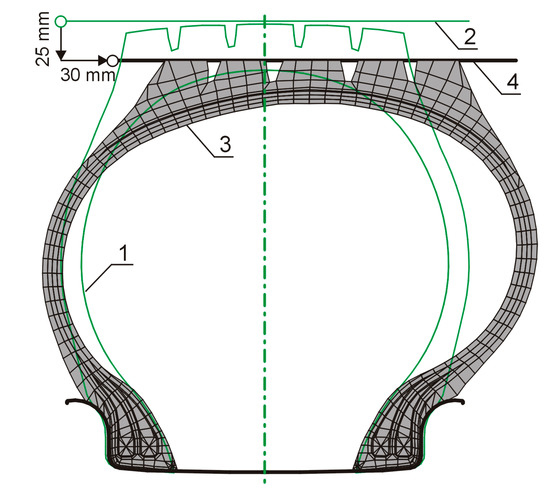 The stage of mounting the tire on the rim was carried out in ten increments through concurrent displacement of the rim in the axial and the radial directions against the position, which was consistent with the actual rim dimensions of 8.0–20 assumed for this tire. At this stage, small values of internal pressure were also applied (0.001pn per increment) to provide for the correct setting of the bead on the rim. A non-deformable rim exerted contact forces on the bead. Forces tangential to the contact surface were calculated according to the Coulomb’s law of friction. The rubber–steel friction coefficient was assumed at 0.6. The profile of a tire mounted on the rim is presented in Figure 5, item 3.