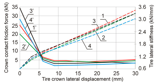 For lateral tire stiffness analysis, a three-dimensional model should be created. Elaboration of such a model is quite a challenge both in terms of the modeling and the required intensity of calculations [26]. Thus, a method of determining apparent lateral stiffness with the use of an axisymmetric tire model was proposed. For this purpose, the deformable flat surface was moved towards the model along the y axis. The contact of this plane with the inflated tire tread produced radial displacement of tread nodes towards the tire rotation axis (Figure 9). Due to the axisymmetry of the tire model, the tire deformation was consistent with the result obtained by placing a tire in a cylinder of decreasing diameter. When the cylinder radius was reduced by an assumed value of 25 mm, it was displaced axially by 30 mm (Figure 9, item 4), and the resultant friction forces generated in tread nodes with the tread remaining with contact with the cylinder were being written. The graph for these forces for a few cord angle values θ0 in the function of tire tread axial displacement are presented in Figure 10, items 1–4. On this basis, the tire apparent lateral stiffness was determined as a derivative of the force with respect to tread axial displacement (Figure 10, items 1’–4’). The apparent lateral stiffness of the analyzed tire indicated the greatest sensitivity to angle θ0 variations for small tread axial displacement (up to 5 mm). By defining the correlation between the tire apparent lateral stiffness and the actual stiffness (e.g., obtained from measurements), it was possible to predict tire lateral stiffness based on an axisymmetric model, i.e., with low costs.