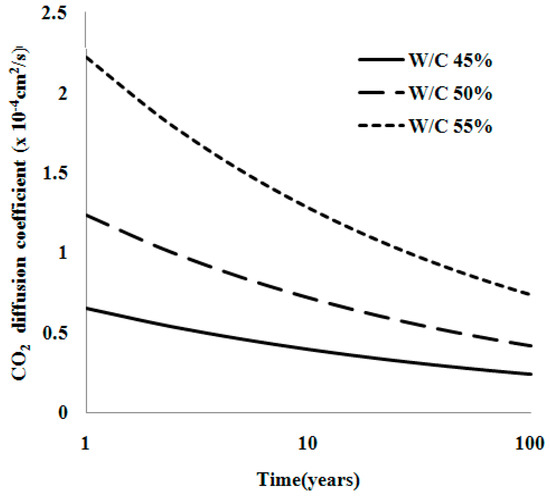 where is the CO2 diffusion coefficient after one year and is the time coefficient reflecting reduction of the diffusion coefficient. The time coefficient () significantly depends on the w/c ratio.