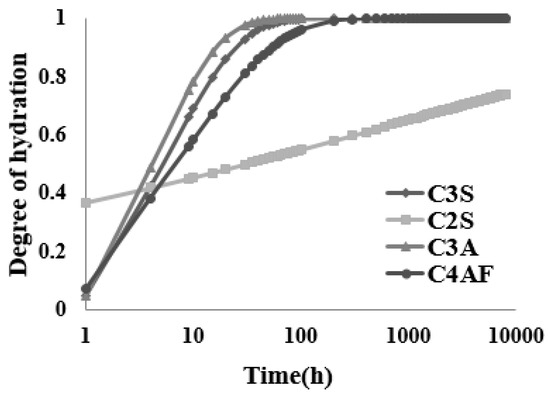 The main constituents of Portland cement include alite, belite, aluminate, and ferrite. Their formulas are C3S, C2S, C3A, and C4AF, respectively. The hydration of each constituent can be calculated by obtaining a weighted average as each compound shows different hydration behaviors even under the same curing condition. Hydration of cement can be calculated using the following Equation (6):