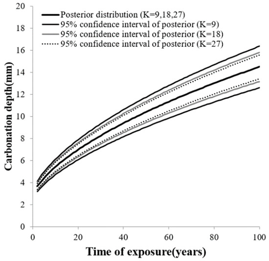 According to the previous study for LHS, a doubled number of design variables, 2n, will converge to the result of the total number of design variables [25]. Moreover, Jung et al. demonstrated that triple design variables, 3n, converge to the result of the total number of design variables considering relatively few design variables [16]. Figure 4 shows that posterior predicted values converge as the number of LHS increases. The proposed carbonation prediction considers three design variables because the cement hydration is directly related to CO2 uptake in Equation (5). The results in Figure 4 show similar trends with results considering 6n (K = 18). Thus, nine samples were considered from an efficiency point of view in this study.
