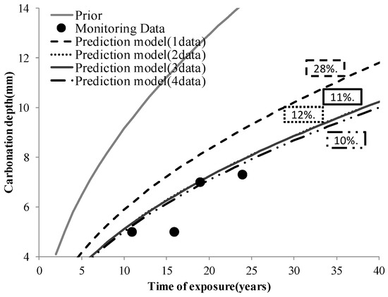 The prior prediction of carbonation depth using design variables was updated according to the different numbers of on-site data. Figure 5 shows prior prediction and updated prediction models as increasing numbers of inspection data in the Gajwa IC viaduct.