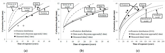 Based on the results of the sensitivity analysis, nine samples for LHS were applied in the proposed durability analysis and the first two field inspection data were then used to revise prior predicted values for carbonation depth of the subject bridges. To compare the effectiveness of the proposed durability analysis, two carbonation prediction models were compared in this study. In the previous studies, Han et al. and Yang have compared several carbonation prediction models and reported that the Kishitani prediction model was suitable for the concrete structures in Korea [11,32]. Moreover, Kwon et al. investigated various field inspection data of carbonation in Korea and proposed the correction factors to revise previous prediction models [33]. Thus, the proposed prediction approach compared with the Kishitani model and the Kwon et al. model is illustrated in Figure 7. The figures show that the updated posterior results are more suitable for predicting carbonation depth with time.