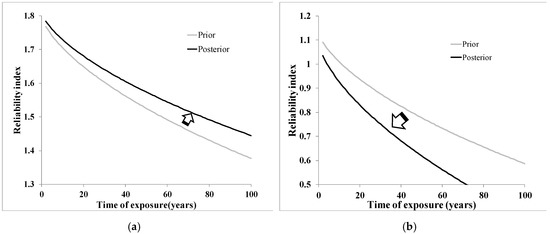 Changes in prior and posterior predicted values for reliability index of the subject bridge. (a) Gajwa IC viaduct; (b) Geoje bridge.