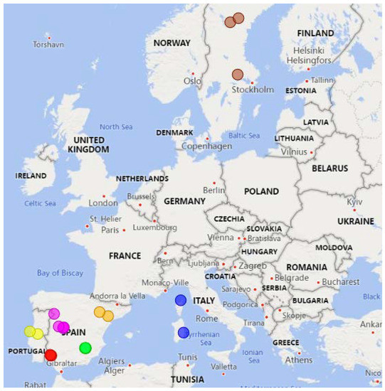 Map of the areas hit by wildfires considered in this study, split by fold. Circles determine the position of the considered wildfires, while each circle colour identifies a specific fold: circles of the same color identify areas of interest attributed to the same fold.