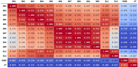 Correlation Matrix computed on burned areas. Spectral Bands B01–B12 refer to the post-fire Sentinel-2 acquisition, dNBR is the Delta Normalized Burn Ratio, and GT is the severity level target variable (i.e., the Copernicus EMS grading map Ground Truth).