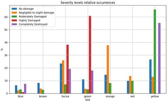 In Section 2.4, the new proposed approach, which leverages on Convolutional Neural Networks (CNNs), will be introduced. Given the huge interest from the scientific community in such algorithms, a common practice is to use consolidated approaches by adapting the general methodology to the investigated domain. As most CNNs, the input size is reduced due to computational performances and hardware limitations during the training phase. The high-resolution images retrieved from Sentinel-Hub (and consequently, the grading maps) have dimensions up to 5000 × 5000 pixels, but the image size is too big to be processed by a CNN in one shot (due to GPU memory limitations), therefore it needs to be re-adapted. In this paper, we opted for preserving all the provided information by tiling the original acquisitions in smaller crops of size 480 × 480 pixels, maintaining the spectral information as provided by Sentinel-Hub. Moreover, only the crops containing at least one pixel classified as burned (a damage severity level between 1 and 4) have been included in the dataset. In the end, the dataset contains a total of 135 crops, distributed in folds as follows; blue fold: 8, brown fold: 9, fucsia fold: 30, green fold: 16, orange fold: 18, red fold: 12, yellow fold: 42. As easily predictable, the dataset’s folds present unbalanced EMS damage severity levels, as shown in Figure 3.