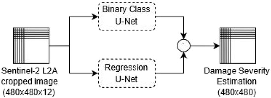 Figure 5. Double-Step U-Net simplified architecture. The damage severity estimation is computed in two steps: burned area identification through the Binary Class U-Net and damage severity estimation by means of Regression U-Net. The Regression U-Net receives as input the Sentinel-2 L2A image filtered with the binary segmentation mask.